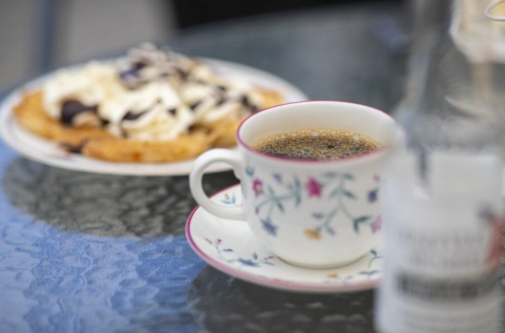 Här serveras hembakat, varma drycker, våfflor, smörgåsar och svala alternativ.